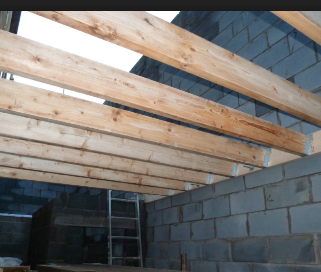 Set out the ceiling joists onto the wall plates the ceiling joists are installed before the rafters as they will stop the roof spreading and also give something for you to lay planks across to stand on when building the roof.